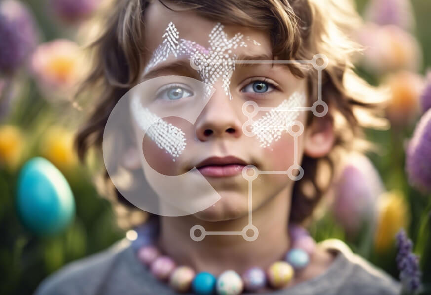 Intra Συλλεκτικό Ξύλινο Παζλ Plywood 4mm - Νεαρό αγόρι με ζωγραφισμένο πρόσωπο στο Πασχαλινό χωράφι με τουλίπες Σε Ξύλινο Κουτί - Διαστάσεις Puzzle: 10x10 cm – 25 κομμάτια