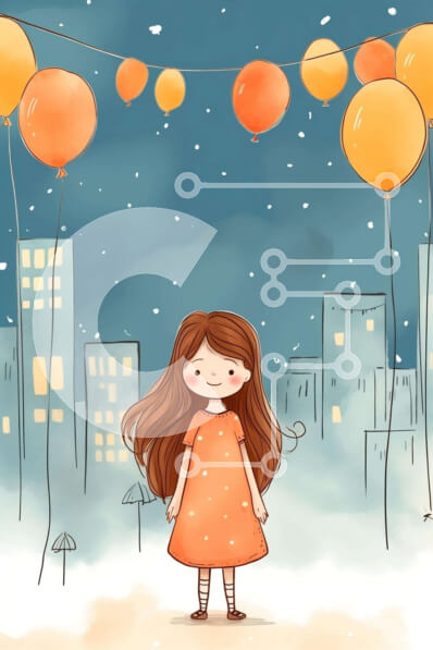Intra Συλλεκτικό Ξύλινο Παζλ Plywood 4mm - Κορίτσι κινουμένων σχεδίων με πορτοκαλί φόρεμα που στέκεται στη χιονισμένη πόλη με πορτοκαλί μπαλόνια και ομπρέλες Σε Ξύλινο Κουτί - Διαστάσεις Puzzle: 10x10 cm – 25 κομμάτια