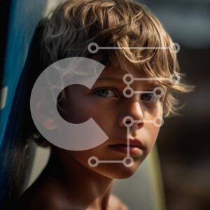 Intra Συλλεκτικό Ξύλινο Παζλ Plywood 4mm - Νεαρό αγόρι με ξανθά μαλλιά και μπλε μάτια που γέρνει σε μια σανίδα του σερφ Σε Ξύλινο Κουτί - Διαστάσεις Puzzle: 10x10 cm – 25 κομμάτια