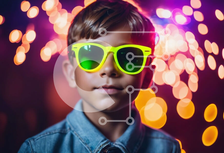 Intra Συλλεκτικό Ξύλινο Παζλ Plywood 4mm - Νεαρό αγόρι με φωτεινά κίτρινα γυαλιά ηλίου με πολύχρωμα φώτα Σε Ξύλινο Κουτί - Διαστάσεις Puzzle: 10x10 cm – 25 κομμάτια