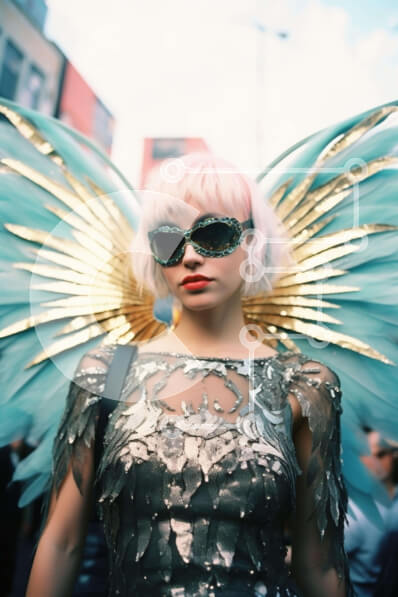 Intra Συλλεκτικό Ξύλινο Παζλ Plywood 4mm - Μοντέρνα γυναίκα με μπλε φόρεμα με χρυσά φτερά και γυαλιά ηλίου Σε Ξύλινο Κουτί - Διαστάσεις Puzzle: 10x10 cm – 25 κομμάτια