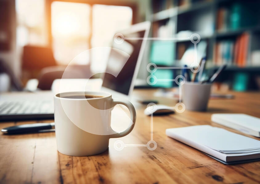 Intra Συλλεκτικό Ξύλινο Παζλ Plywood 4mm - Κούπα καφέ σε ξύλινο γραφείο με φορητό υπολογιστή και βιβλία Σε Ξύλινο Κουτί - Διαστάσεις Puzzle: 10x10 cm – 25 κομμάτια
