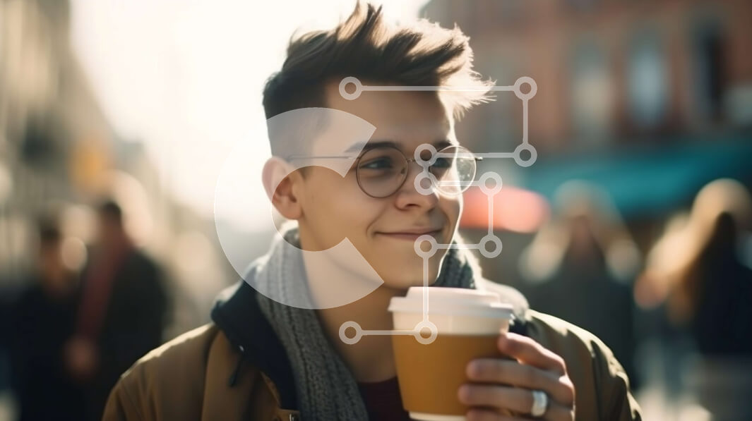Intra Συλλεκτικό Ξύλινο Παζλ Plywood 4mm - Νεαρός άνδρας που κρατά το φλιτζάνι καφέ σε έναν πολυσύχναστο δρόμο Σε Ξύλινο Κουτί - Διαστάσεις Puzzle: 10x10 cm – 25 κομμάτια