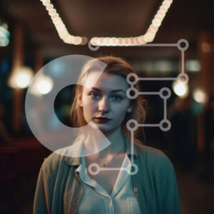 Intra Συλλεκτικό Ξύλινο Παζλ Plywood 4mm - Ξανθιά γυναίκα με πράσινο πουλόβερ που στέκεται σε αμυδρά φωτισμένο δωμάτιο με πολυέλαιο Σε Ξύλινο Κουτί - Διαστάσεις Puzzle: 10x10 cm – 25 κομμάτια