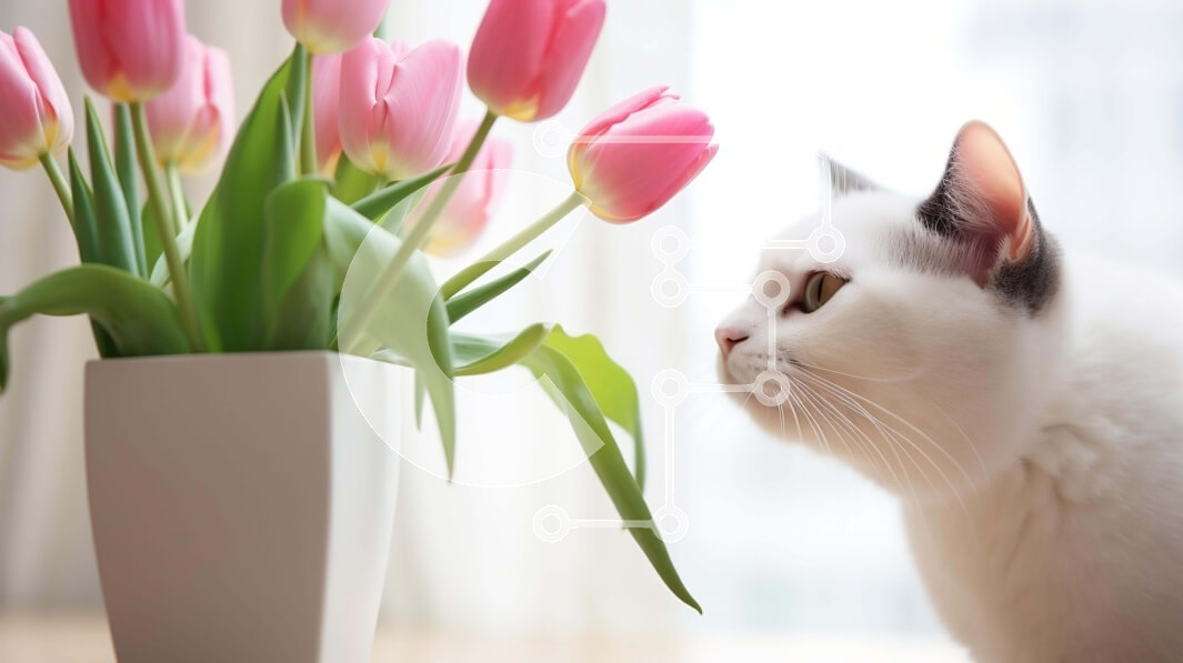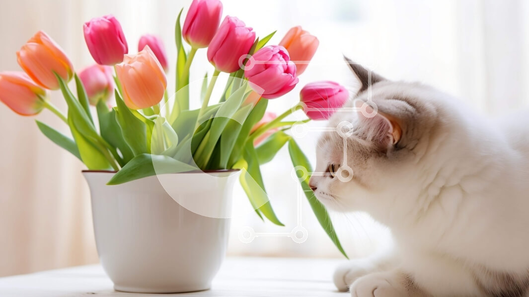 Intra Συλλεκτικό Ξύλινο Παζλ Plywood 4mm - Λευκή γάτα που κάθεται δίπλα στις ροζ τουλίπες Σε Ξύλινο Κουτί - Διαστάσεις: 10x10 cm – 25 κομμάτια