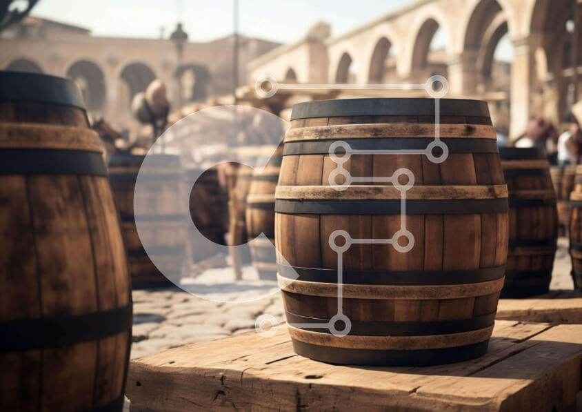 Intra Συλλεκτικό Ξύλινο Παζλ Plywood 4mm - Ξύλινα βαρέλια και άνθρωποι σε ένα πλακόστρωτο σοκάκι Σε Ξύλινο Κουτί - Διαστάσεις Puzzle: 10x10 cm – 25 κομμάτια