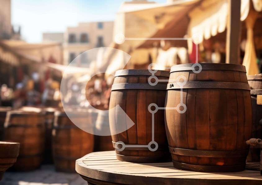 Intra Συλλεκτικό Ξύλινο Παζλ Plywood 4mm - Ξύλινα βαρέλια και άνθρωποι σε μια υπαίθρια αγορά Σε Ξύλινο Κουτί - Διαστάσεις: 10x10 cm – 25 κομμάτια
