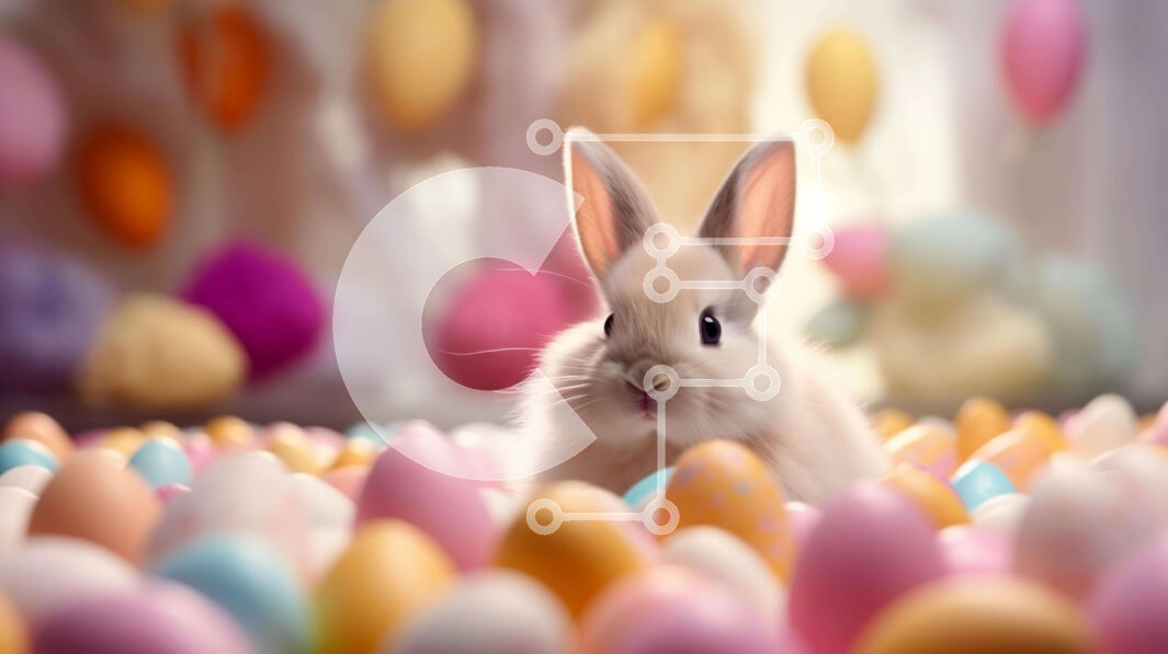 Intra Συλλεκτικό Ξύλινο Παζλ Plywood 4mm - Λευκό λαγουδάκι που περιβάλλεται από πασχαλινά αυγά και μπαλόνια Σε Ξύλινο Κουτί - Διαστάσεις: 10x10 cm – 25 κομμάτια