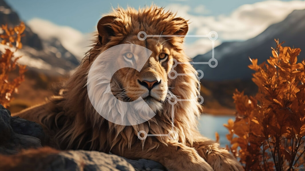 Intra Συλλεκτικό Ξύλινο Παζλ Plywood 4mm - Λιοντάρι με χαίτη σε μια χλοώδη περιοχή με βουνά Σε Ξύλινο Κουτί - Διαστάσεις: 10x10 cm – 25 κομμάτια