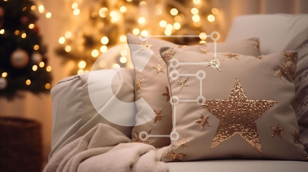 Intra Συλλεκτικό Ξύλινο Παζλ Plywood 4mm - Μαξιλάρια χρυσού αστεριού σε λευκό καναπέ με χριστουγεννιάτικο δέντρο Σε Ξύλινο Κουτί - Διαστάσεις: 10x10 cm – 25 κομμάτια