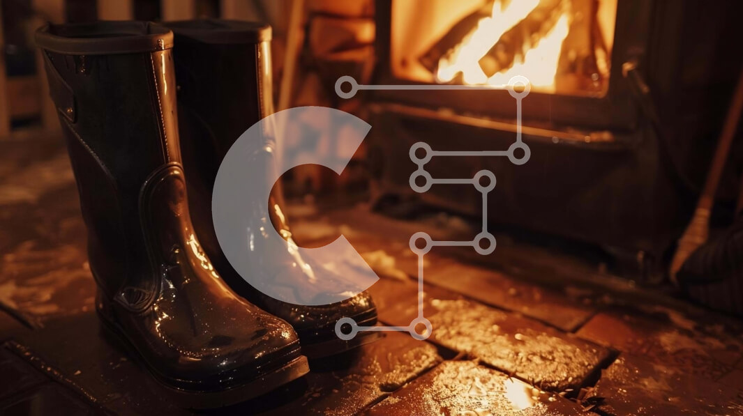 Intra Συλλεκτικό Ξύλινο Παζλ Plywood 4mm - Μαύρες μπότες βροχής δίπλα στο τζάκι Σε Ξύλινο Κουτί - Διαστάσεις: 10x10 cm – 25 κομμάτια