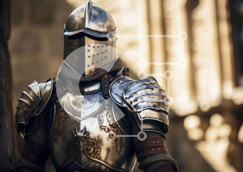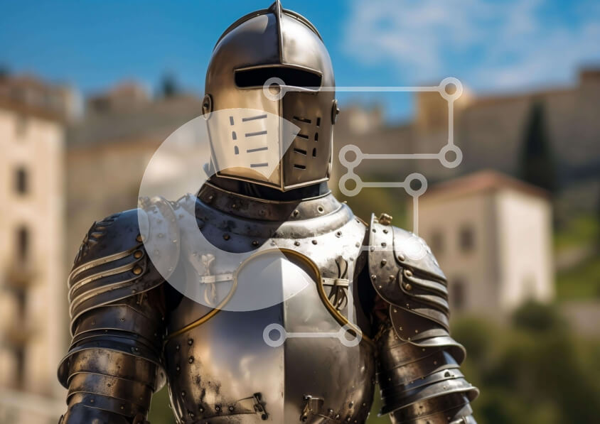 Intra Συλλεκτικό Ξύλινο Παζλ Plywood 4mm - Μεσαιωνικός ιππότης με πλήρη πανοπλία που στέκεται μπροστά από το παλιό πέτρινο κτίριο Σε Ξύλινο Κουτί - Διαστάσεις Puzzle: 10x10 cm – 25 κομμάτια