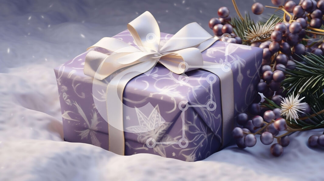 Intra Συλλεκτικό Ξύλινο Παζλ Plywood 4mm - Μωβ δώρο τυλιγμένο σε λευκό χαρτί με χιόνι και μούρα Σε Ξύλινο Κουτί - Διαστάσεις: 10x10 cm – 25 κομμάτια