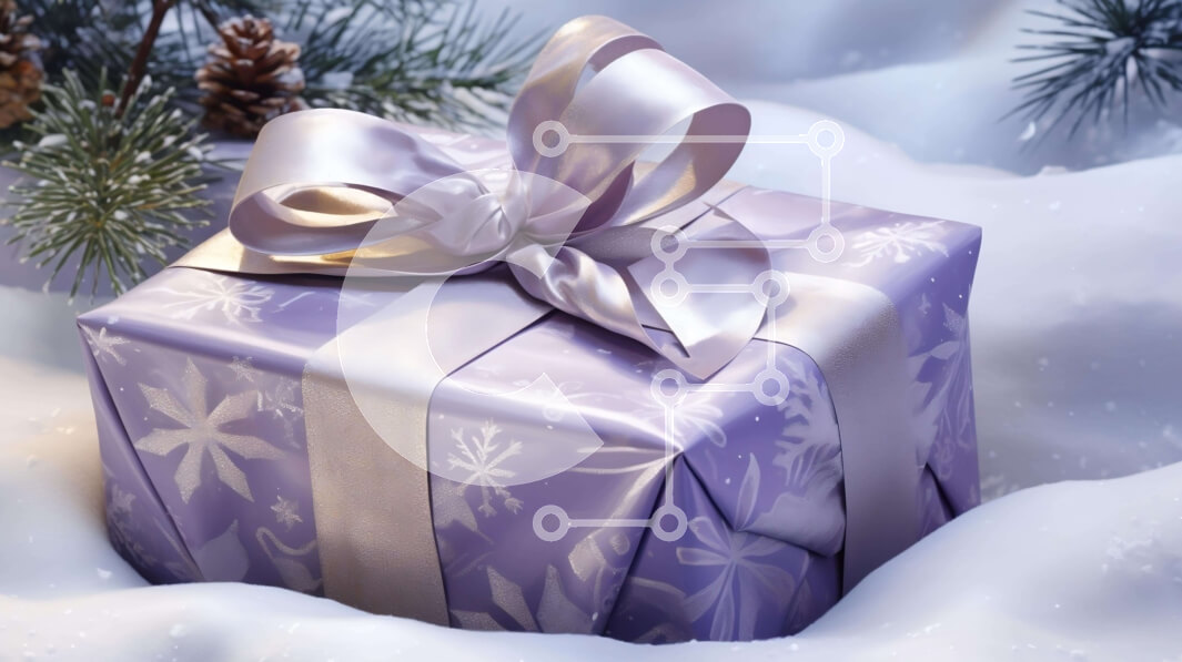 Intra Συλλεκτικό Ξύλινο Παζλ Plywood 4mm - Μωβ δώρο τυλιγμένο σε λευκό με ασημί κορδέλα στο χιόνι Σε Ξύλινο Κουτί - Διαστάσεις Puzzle: 10x10 cm – 25 κομμάτια
