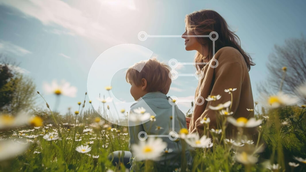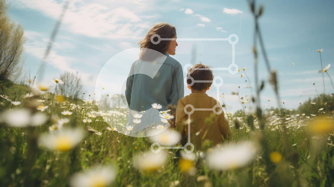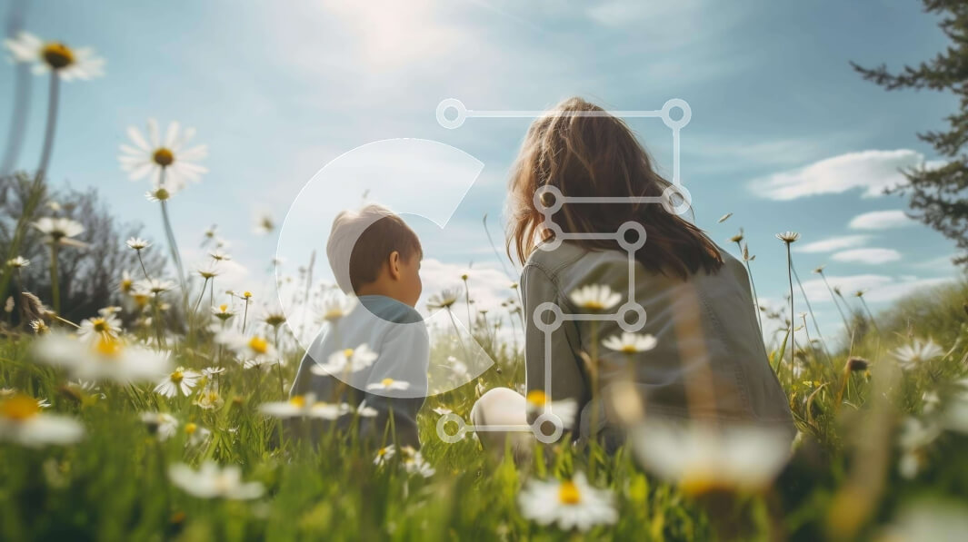 Intra Συλλεκτικό Ξύλινο Παζλ Plywood 4mm - Μητέρα και γιος στο Grassy Meadow με τις μαργαρίτες Σε Ξύλινο Κουτί - Διαστάσεις Puzzle: 10x10 cm – 25 κομμάτια