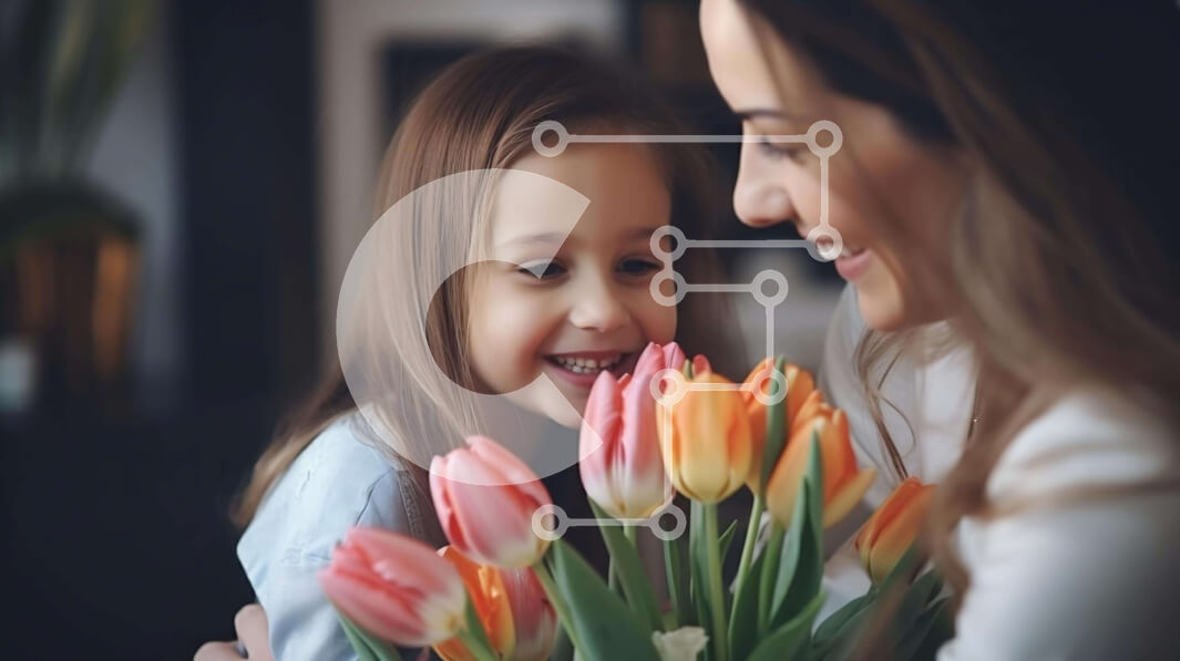 Intra Συλλεκτικό Ξύλινο Παζλ Plywood 4mm - Μητέρα και κόρη αγκαλιάζονται με ροζ λουλούδια τουλίπας Σε Ξύλινο Κουτί - Διαστάσεις Puzzle: 10x10 cm – 25 κομμάτια