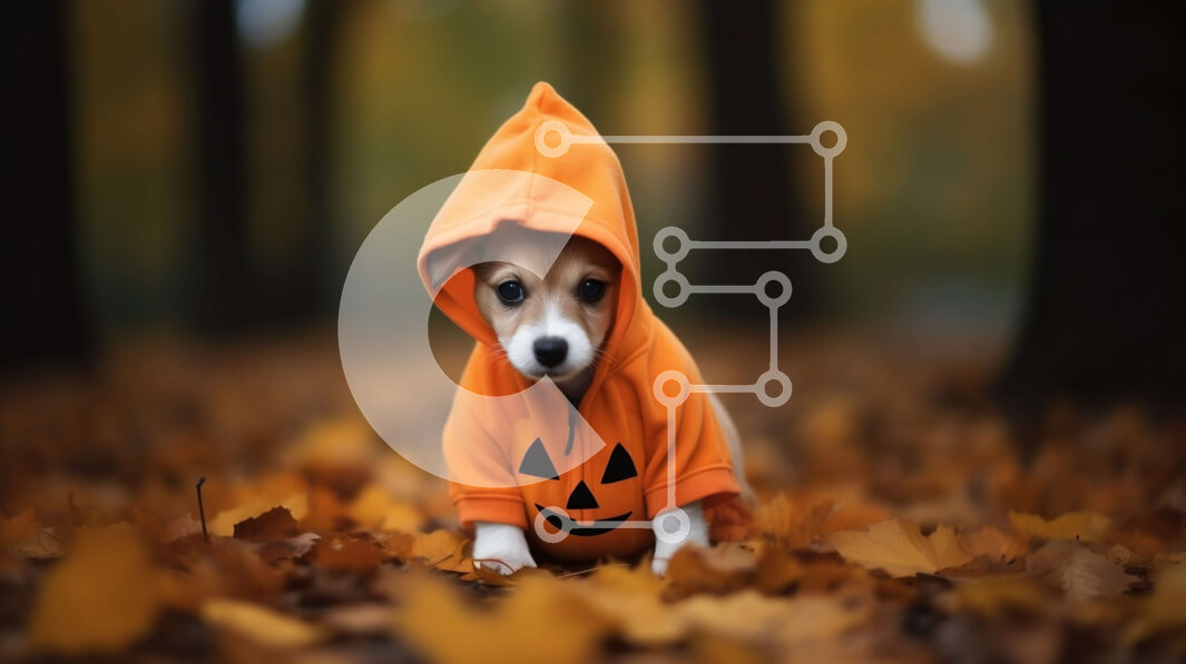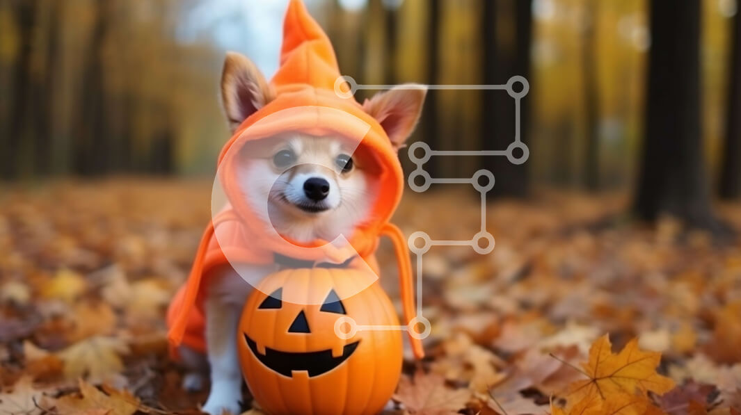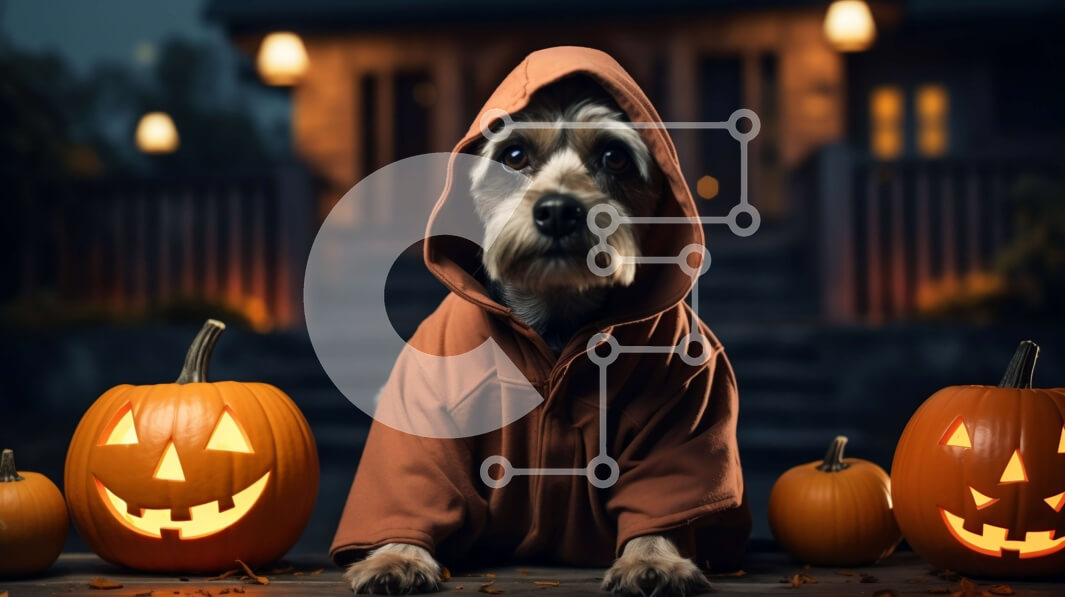 Intra Συλλεκτικό Ξύλινο Παζλ Plywood 4mm - Μικρό σκυλί με καφέ κουκούλα που κάθεται μπροστά από σκαλιστές κολοκύθες Σε Ξύλινο Κουτί - Διαστάσεις: 10x10 cm – 25 κομμάτια