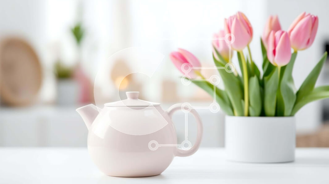 Intra Συλλεκτικό Ξύλινο Παζλ Plywood 4mm - Λευκή τσαγιέρα και ροζ τουλίπες με φορητό υπολογιστή Σε Ξύλινο Κουτί - Διαστάσεις Puzzle: 10x10 cm – 25 κομμάτια