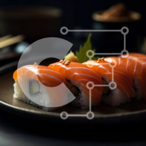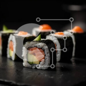 Intra Συλλεκτικό Ξύλινο Παζλ Plywood 4mm - Νόστιμο πιάτο σούσι με φρέσκο σολομό και αβοκάντο σε σκούρο φόντο Σε Ξύλινο Κουτί - Διαστάσεις: 10x10 cm – 25 κομμάτια