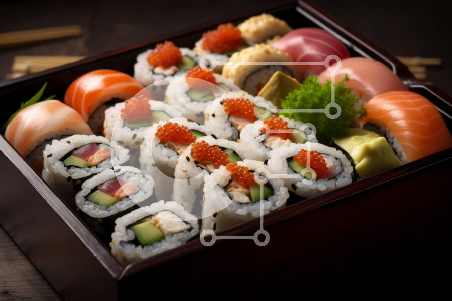 Intra Συλλεκτικό Ξύλινο Παζλ Plywood 4mm - Νόστιμο πιάτο σούσι με φρέσκο σολομό και ρολά αβοκάντο Σε Ξύλινο Κουτί - Διαστάσεις: 10x10 cm – 25 κομμάτια