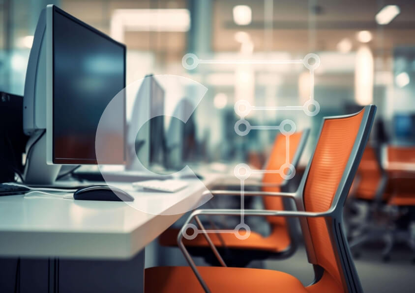 Intra Συλλεκτικό Ξύλινο Παζλ Plywood 4mm - Μοντέρνος χώρος γραφείου με πορτοκαλί καρέκλες και οθόνες υπολογιστών Σε Ξύλινο Κουτί - Διαστάσεις Puzzle: 10x10 cm – 25 κομμάτια