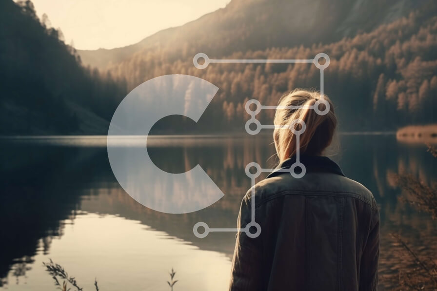 Intra Συλλεκτικό Ξύλινο Παζλ Plywood 4mm - Όμορφο τοπίο μιας ορεινής λίμνης στο ηλιοβασίλεμα με μια γυναίκα που στέκεται στην ακτή Σε Ξύλινο Κουτί - Διαστάσεις: 10x10 cm – 25 κομμάτια