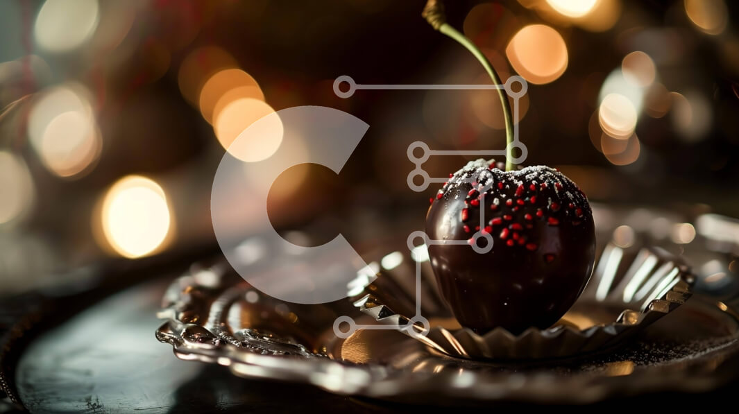 Intra Συλλεκτικό Ξύλινο Παζλ Plywood 4mm - Μαύρη σοκολάτα κεράσι σε ασημένιο πιάτο με φώτα Bokeh Σε Ξύλινο Κουτί - Διαστάσεις: 10x10 cm – 25 κομμάτια