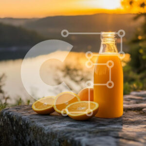 Intra Συλλεκτικό Ξύλινο Παζλ Plywood 4mm - Μπουκάλι χυμό πορτοκαλιού με κομμένα πορτοκάλια στο ηλιοβασίλεμα Σε Ξύλινο Κουτί - Διαστάσεις: 10x10 cm – 25 κομμάτια