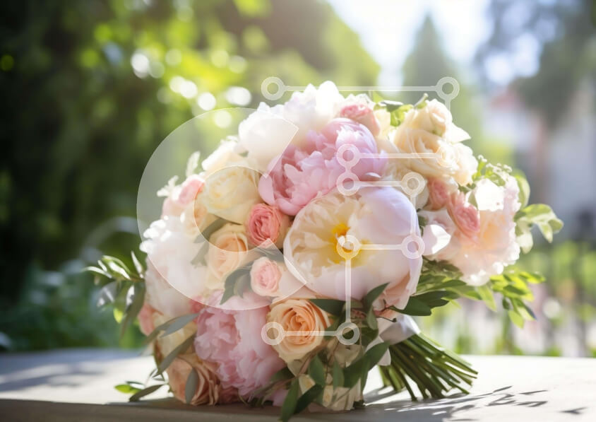 Intra Συλλεκτικό Ξύλινο Παζλ Plywood 4mm - Μπουκέτο με λευκά, ροζ και ροδακινί λουλούδια σε τραπέζι εξωτερικού χώρου Σε Ξύλινο Κουτί - Διαστάσεις: 10x10 cm – 25 κομμάτια