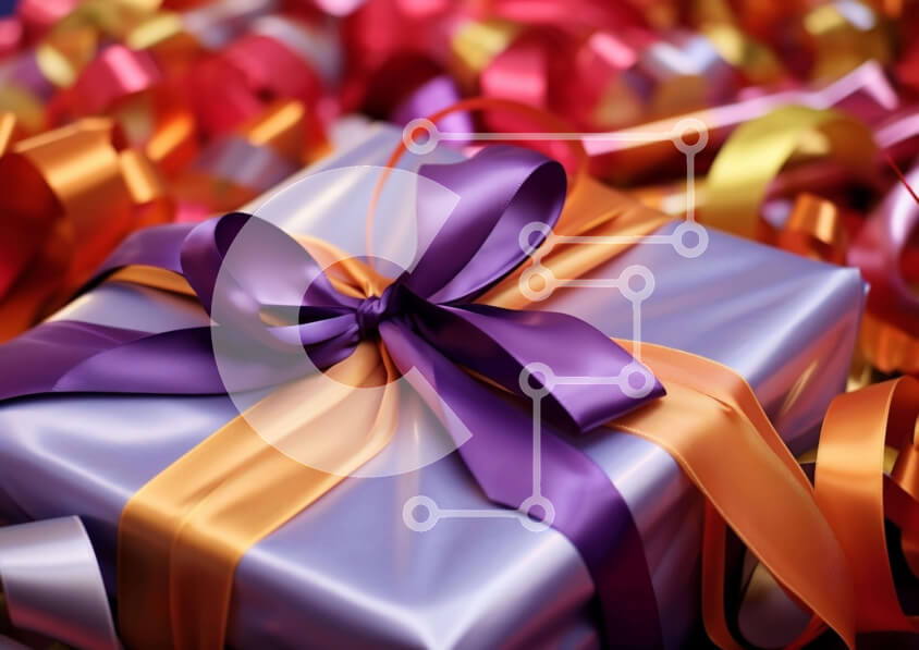 Intra Συλλεκτικό Ξύλινο Παζλ Plywood 4mm - Μωβ Κουτί δώρου με πορτοκαλί κορδέλα και πολύχρωμους φιόγκους Σε Ξύλινο Κουτί - Διαστάσεις: 10x10 cm – 25 κομμάτια