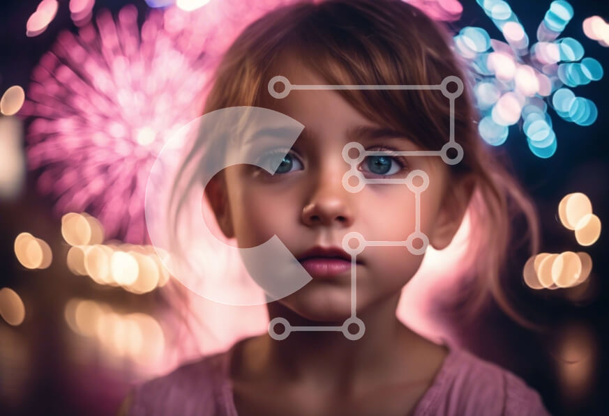 Intra Συλλεκτικό Ξύλινο Παζλ Plywood 4mm - Νεαρό κορίτσι κοιτάζει την κάμερα με ορθάνοιχτα μάτια μπροστά από πυροτεχνήματα Σε Ξύλινο Κουτί - Διαστάσεις Puzzle: 10x10 cm – 25 κομμάτια