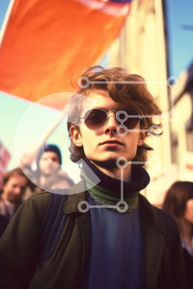 Intra Συλλεκτικό Ξύλινο Παζλ Plywood 4mm - Νεαρός άνδρας με γυαλιά ηλίου που κρατούν την πορτοκαλί σημαία στο πλήθος Σε Ξύλινο Κουτί - Διαστάσεις Puzzle: 10x10 cm – 25 κομμάτια