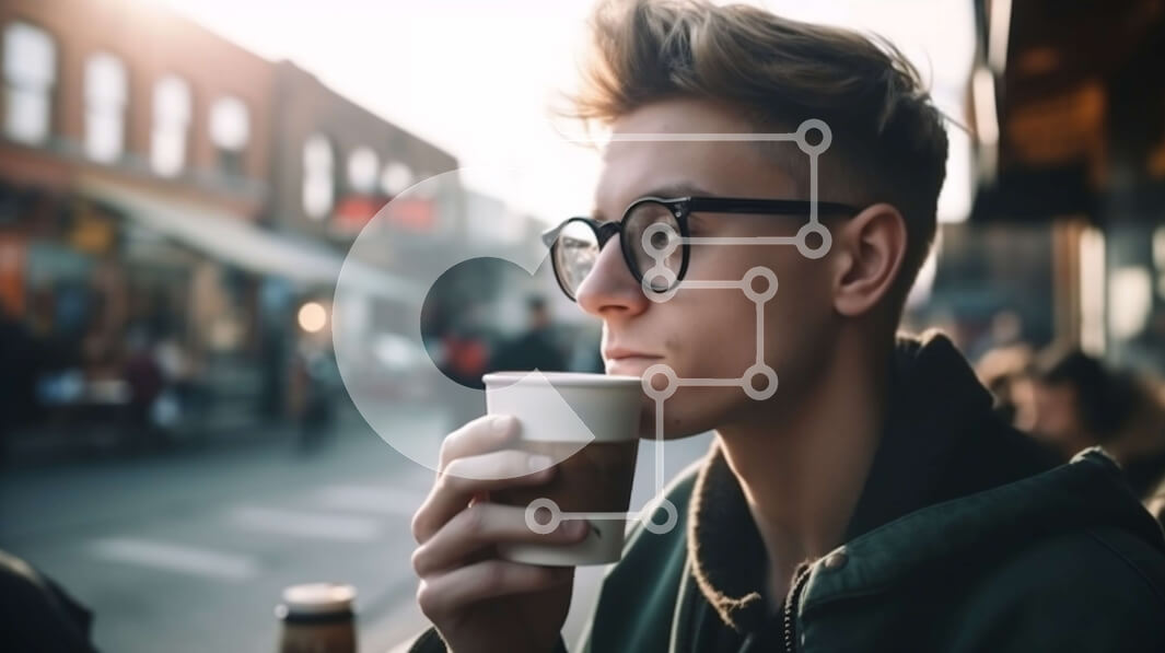 Intra Συλλεκτικό Ξύλινο Παζλ Plywood 4mm - Νεαρός άνδρας με γυαλιά και κουκούλα που κάθεται σε εξωτερικούς χώρους με καφέ και τηλέφωνο Σε Ξύλινο Κουτί - Διαστάσεις Puzzle: 10x10 cm – 25 κομμάτια