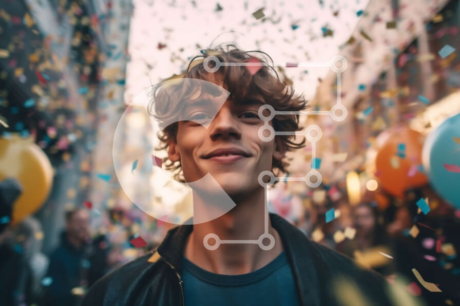 Intra Συλλεκτικό Ξύλινο Παζλ Plywood 4mm - Νεαρός άνδρας με μαύρο δερμάτινο μπουφάν που περιβάλλεται από πολύχρωμα κομφετί Σε Ξύλινο Κουτί - Διαστάσεις Puzzle: 10x10 cm – 25 κομμάτια