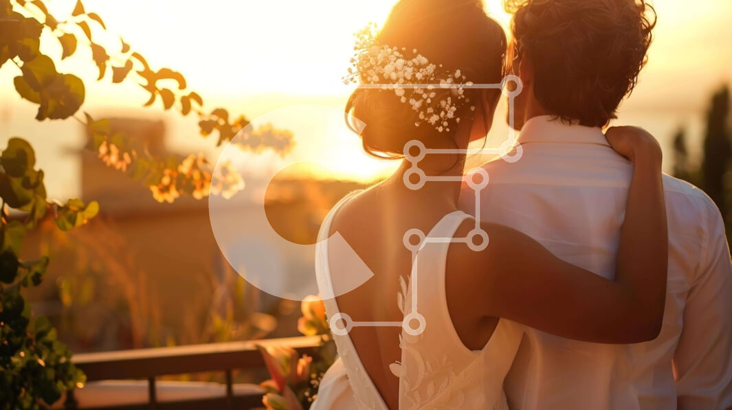 Intra Συλλεκτικό Ξύλινο Παζλ Plywood 4mm - Νεόνυμφο ζευγάρι που αγκαλιάζεται στο ηλιοβασίλεμα πάνω από τον ωκεανό Σε Ξύλινο Κουτί - Διαστάσεις Puzzle: 10x10 cm – 25 κομμάτια