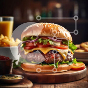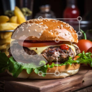 Intra Συλλεκτικό Ξύλινο Παζλ Plywood 4mm - Νόστιμο Cheeseburger με φρέσκα λαχανικά σε ξύλινη σανίδα Σε Ξύλινο Κουτί - Διαστάσεις: 10x10 cm – 25 κομμάτια