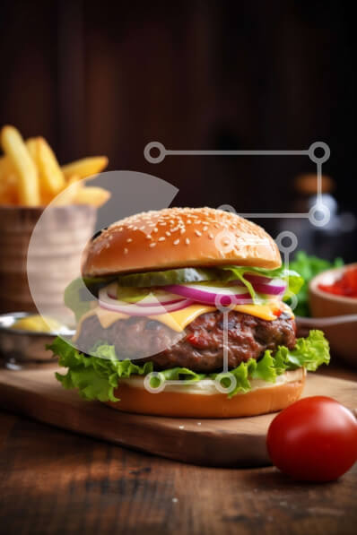 Intra Συλλεκτικό Ξύλινο Παζλ Plywood 4mm - Νόστιμο Cheeseburger με φρέσκα λαχανικά και τραγανές πατάτες σε ένα ρουστίκ ξύλινο τραπέζι Σε Ξύλινο Κουτί - Διαστάσεις: 10x10 cm – 25 κομμάτια