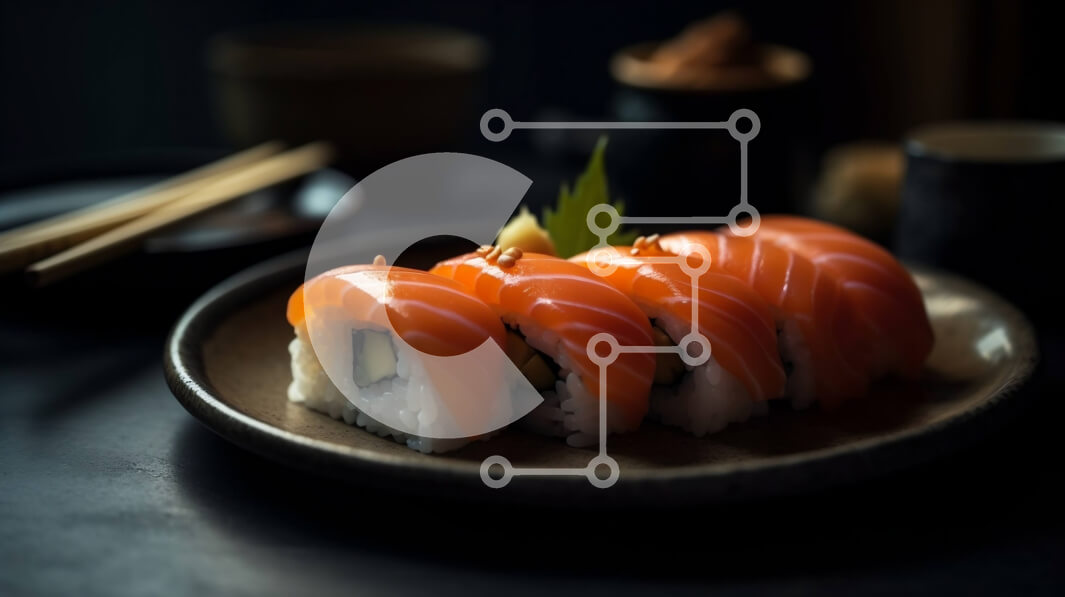 Intra Συλλεκτικό Ξύλινο Παζλ Plywood 4mm - Νόστιμο πιάτο σούσι με φρέσκο σολομό και ρολά αβοκάντο Σε Ξύλινο Κουτί - Διαστάσεις: 10x10 cm – 25 κομμάτια