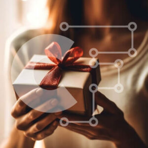 Intra Συλλεκτικό Ξύλινο Παζλ Plywood 4mm - Όμορφη εικόνα γυναίκας που κρατά κουτί δώρου με κόκκινη κορδέλα μπροστά από τα χριστουγεννιάτικα φώτα Σε Ξύλινο Κουτί - Διαστάσεις: 10x10 cm – 25 κομμάτια