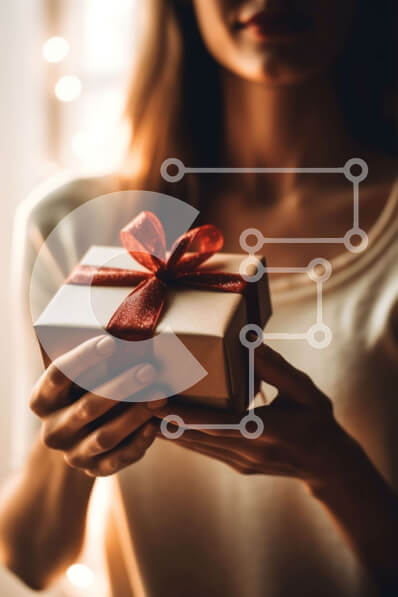 Intra Συλλεκτικό Ξύλινο Παζλ Plywood 4mm - Όμορφη εικόνα γυναίκας που κρατά κουτί δώρου με κόκκινη κορδέλα μπροστά από τα χριστουγεννιάτικα φώτα Σε Ξύλινο Κουτί - Διαστάσεις: 10x10 cm – 25 κομμάτια