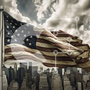 Intra Συλλεκτικό Ξύλινο Παζλ Plywood 4mm - Πατριωτική αμερικανική σημαία που κυματίζει μπροστά από έναν θυελλώδη ορίζοντα της πόλης Σε Ξύλινο Κουτί - Διαστάσεις Puzzle: 10x10 cm – 25 κομμάτια