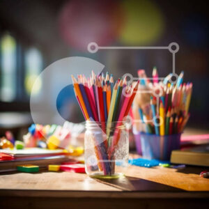 Intra Συλλεκτικό Ξύλινο Παζλ Plywood 4mm - Πολύχρωμα σχολικά είδη σε ξύλινο τραπέζι Σε Ξύλινο Κουτί - Διαστάσεις Puzzle: 10x10 cm – 25 κομμάτια