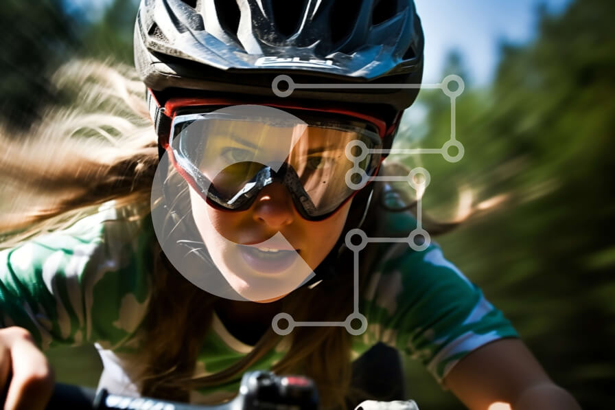 Intra Συλλεκτικό Ξύλινο Παζλ Plywood 4mm - Περιπετειώδης γυναίκα για ορεινή ποδηλασία κάτω από το μονοπάτι με πράσινο κράνος και γυαλιά Σε Ξύλινο Κουτί - Διαστάσεις Puzzle: 10x10 cm – 25 κομμάτια