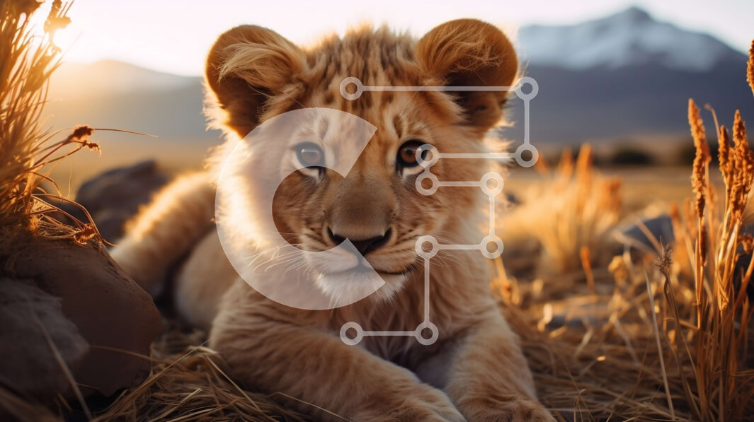 Intra Συλλεκτικό Ξύλινο Παζλ Plywood 4mm - Περίεργο λιοντάρι στο γρασίδι με βουνά στο βάθος Σε Ξύλινο Κουτί - Διαστάσεις: 10x10 cm – 25 κομμάτια