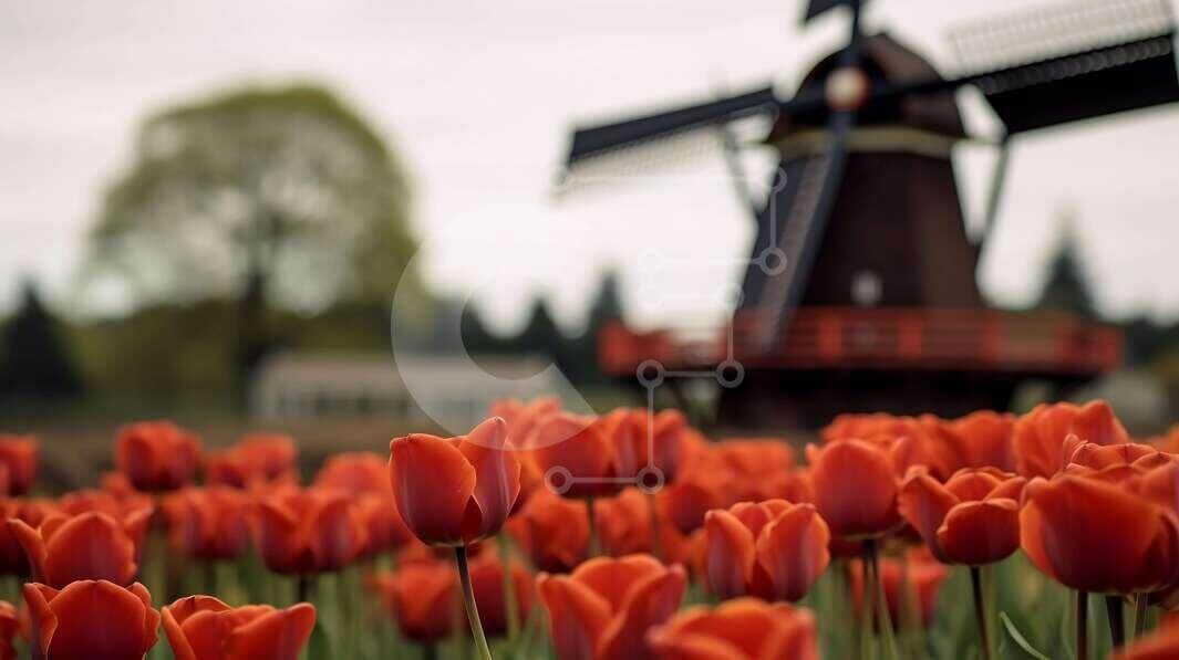 Intra Συλλεκτικό Ξύλινο Παζλ Plywood 4mm - Πεδίο με κόκκινες τουλίπες με ανεμόμυλο στο φόντο Σε Ξύλινο Κουτί - Διαστάσεις: 10x10 cm – 25 κομμάτια