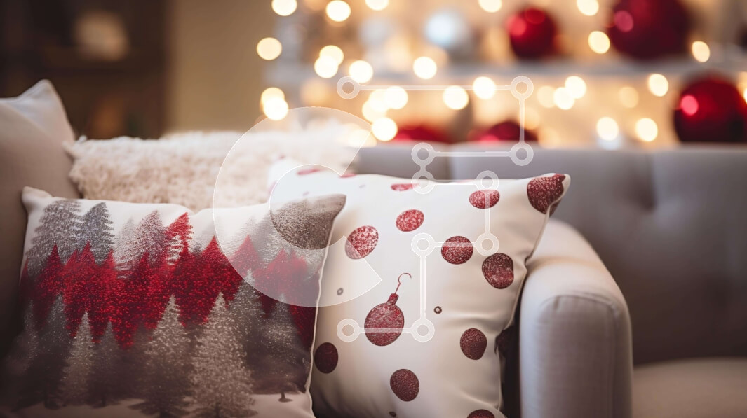 Intra Συλλεκτικό Ξύλινο Παζλ Plywood 4mm - Σαλόνι διακοσμημένο για τα Χριστούγεννα με κόκκινα και λευκά μαξιλάρια Σε Ξύλινο Κουτί - Διαστάσεις Puzzle: 10x10 cm – 25 κομμάτια