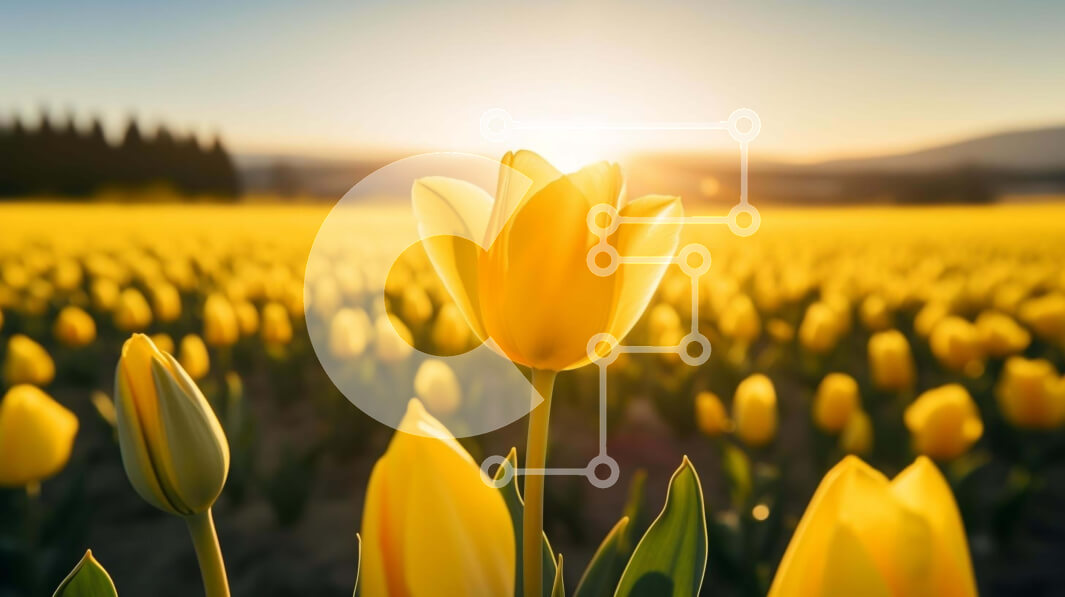 Intra Συλλεκτικό Ξύλινο Παζλ Plywood 4mm - Πεδίο των κίτρινων τουλιπών με το ηλιοβασίλεμα Σε Ξύλινο Κουτί - Διαστάσεις: 10x10 cm – 25 κομμάτια
