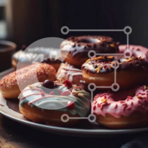 Intra Συλλεκτικό Ξύλινο Παζλ Plywood 4mm - Πιάτο με πολύχρωμα γυαλισμένα ντόνατς σε ένα ξύλινο τραπέζι με θέα στον ορίζοντα της πόλης Σε Ξύλινο Κουτί - Διαστάσεις: 10x10 cm – 25 κομμάτια