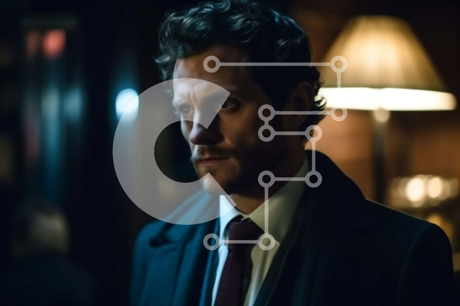 Intra Συλλεκτικό Ξύλινο Παζλ Plywood 4mm - Σοβαρό άτομο με μαύρο κοστούμι και δεσμό στο αμυδρά φωτισμένο δωμάτιο Στοκ Φωτογραφία Σε Ξύλινο Κουτί - Διαστάσεις Puzzle: 10x10 cm – 25 κομμάτια