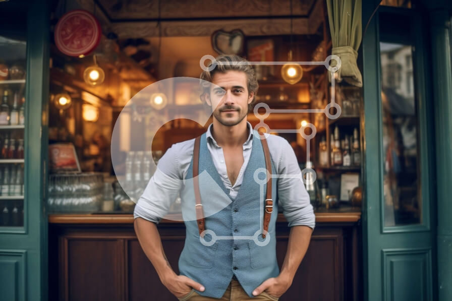 Intra Συλλεκτικό Ξύλινο Παζλ Plywood 4mm - Σοβαρός άνδρας με γιλέκο και ζαρτιέρες που στέκονται μπροστά από το μπαρ Σε Ξύλινο Κουτί - Διαστάσεις Puzzle: 10x10 cm – 25 κομμάτια